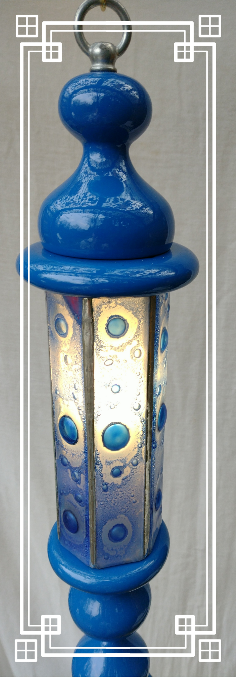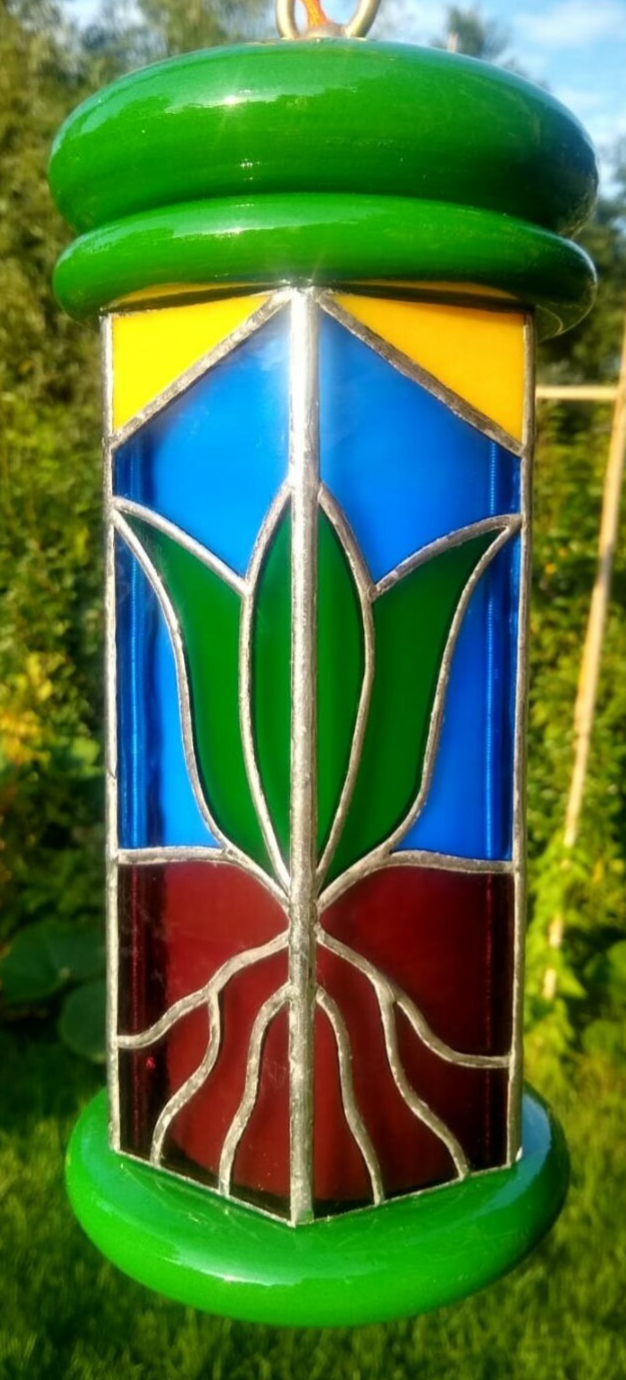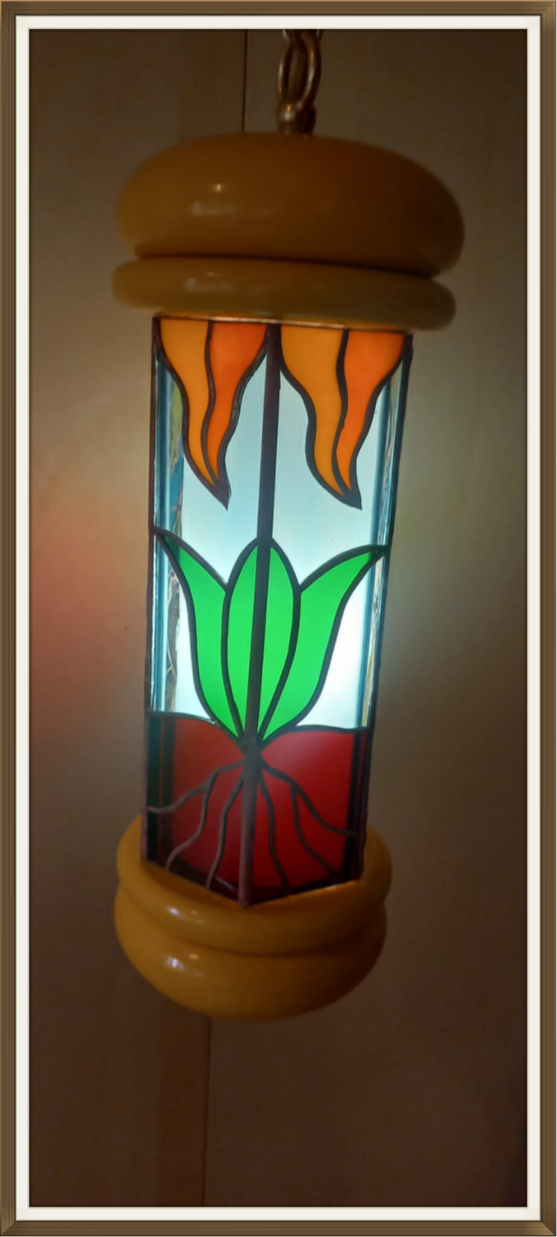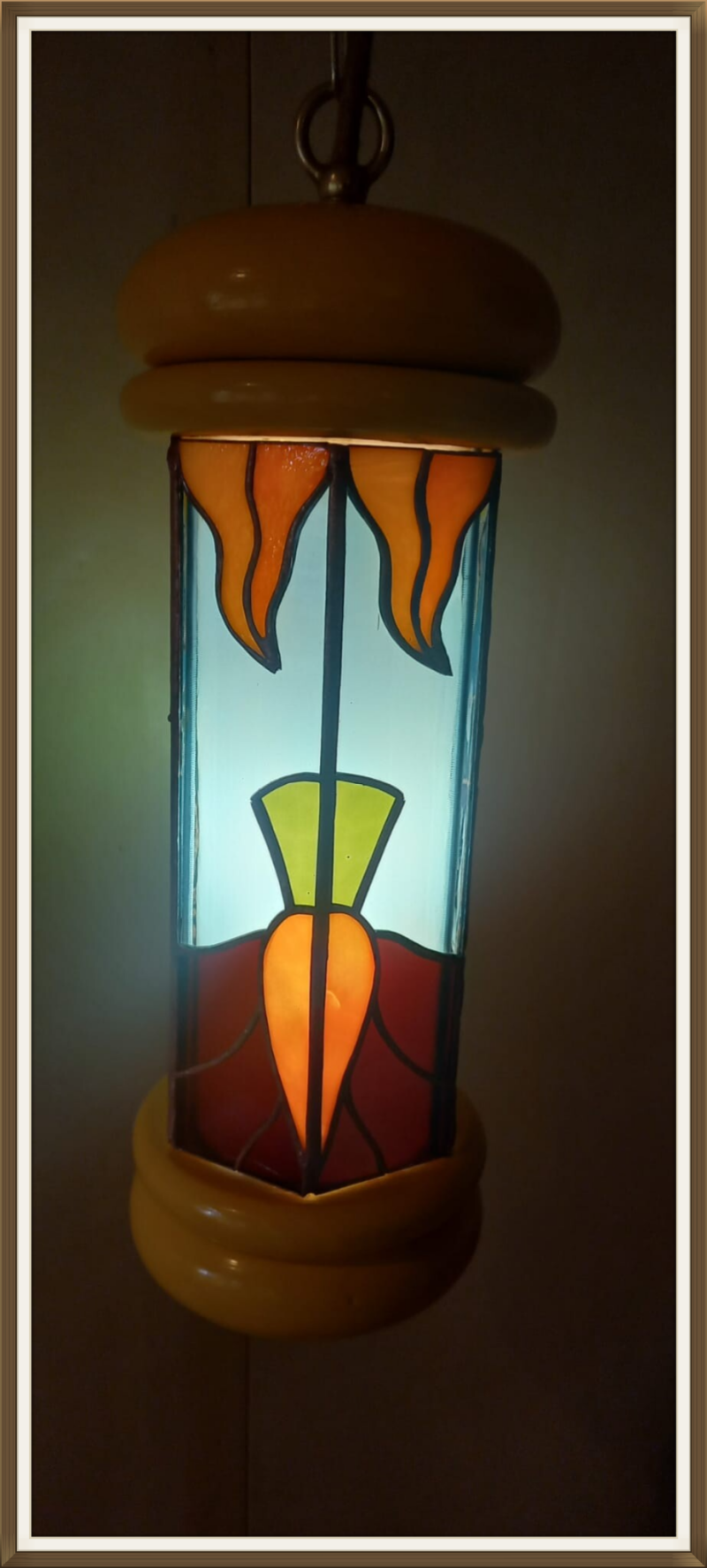 Onderstaande lamp is uitgevoerd in koperfolie techniek met brandschilderen en houtgedraaide knoppen