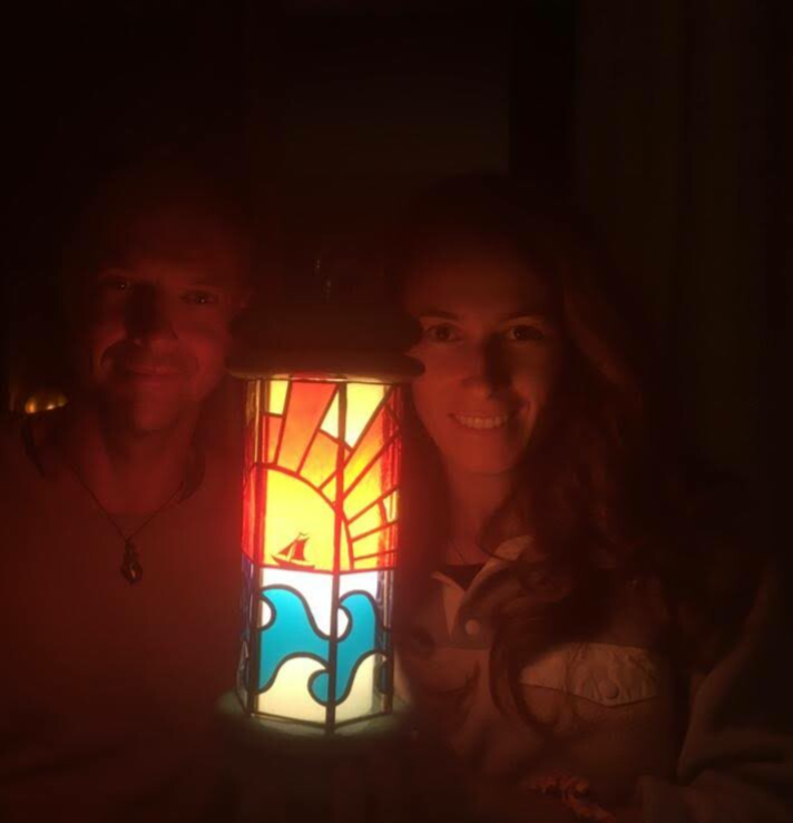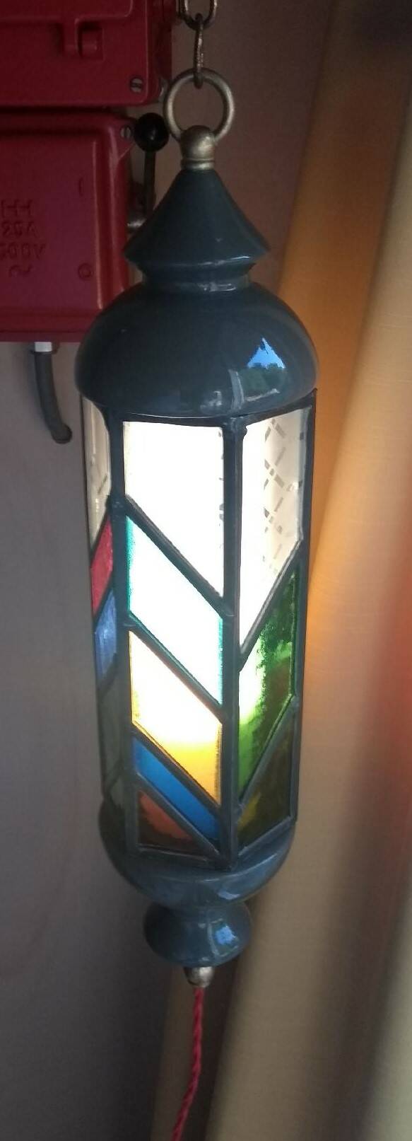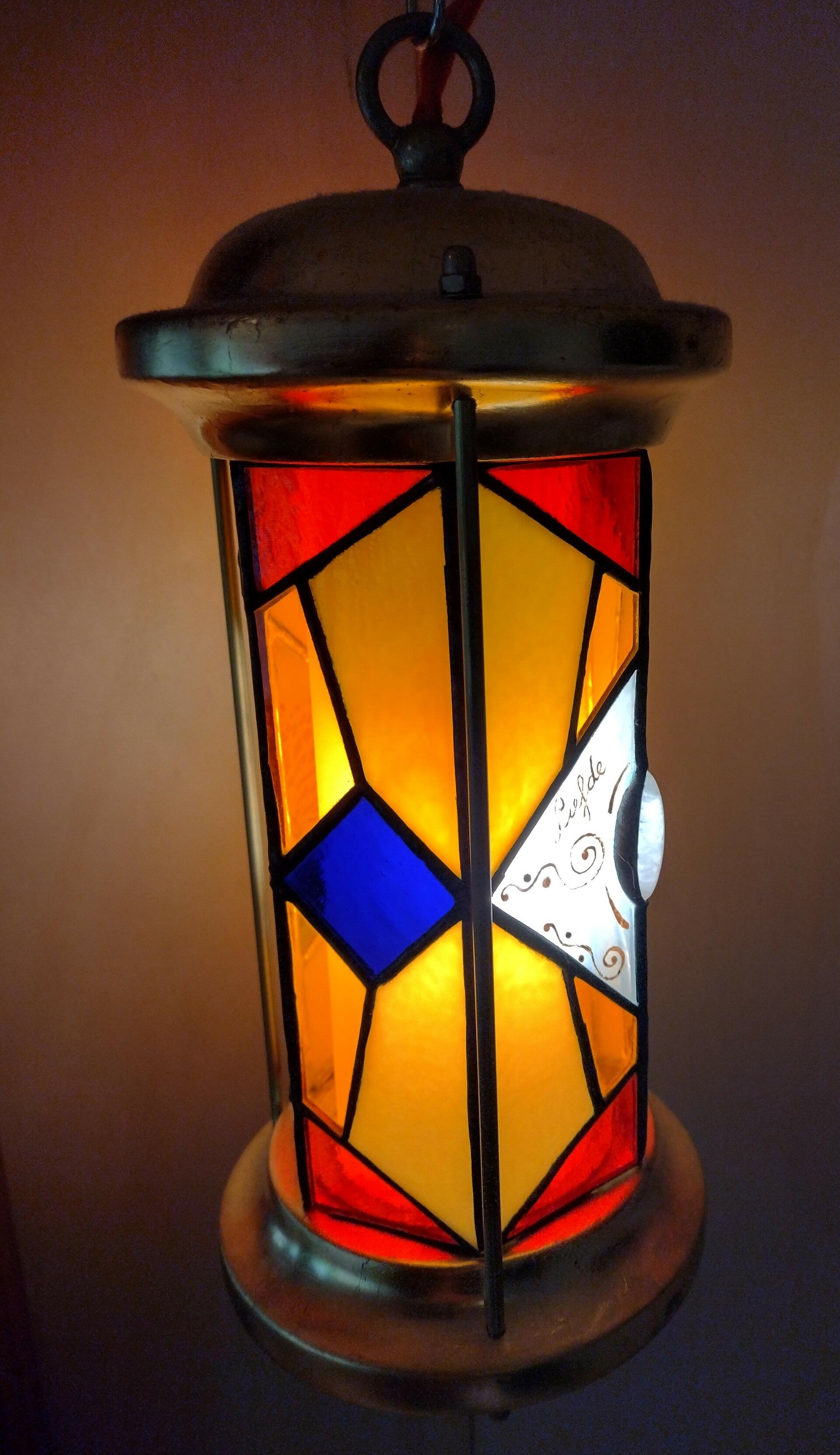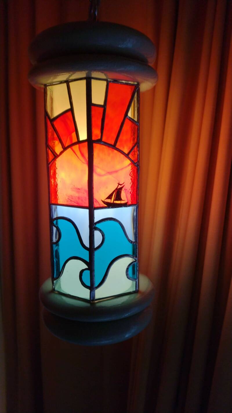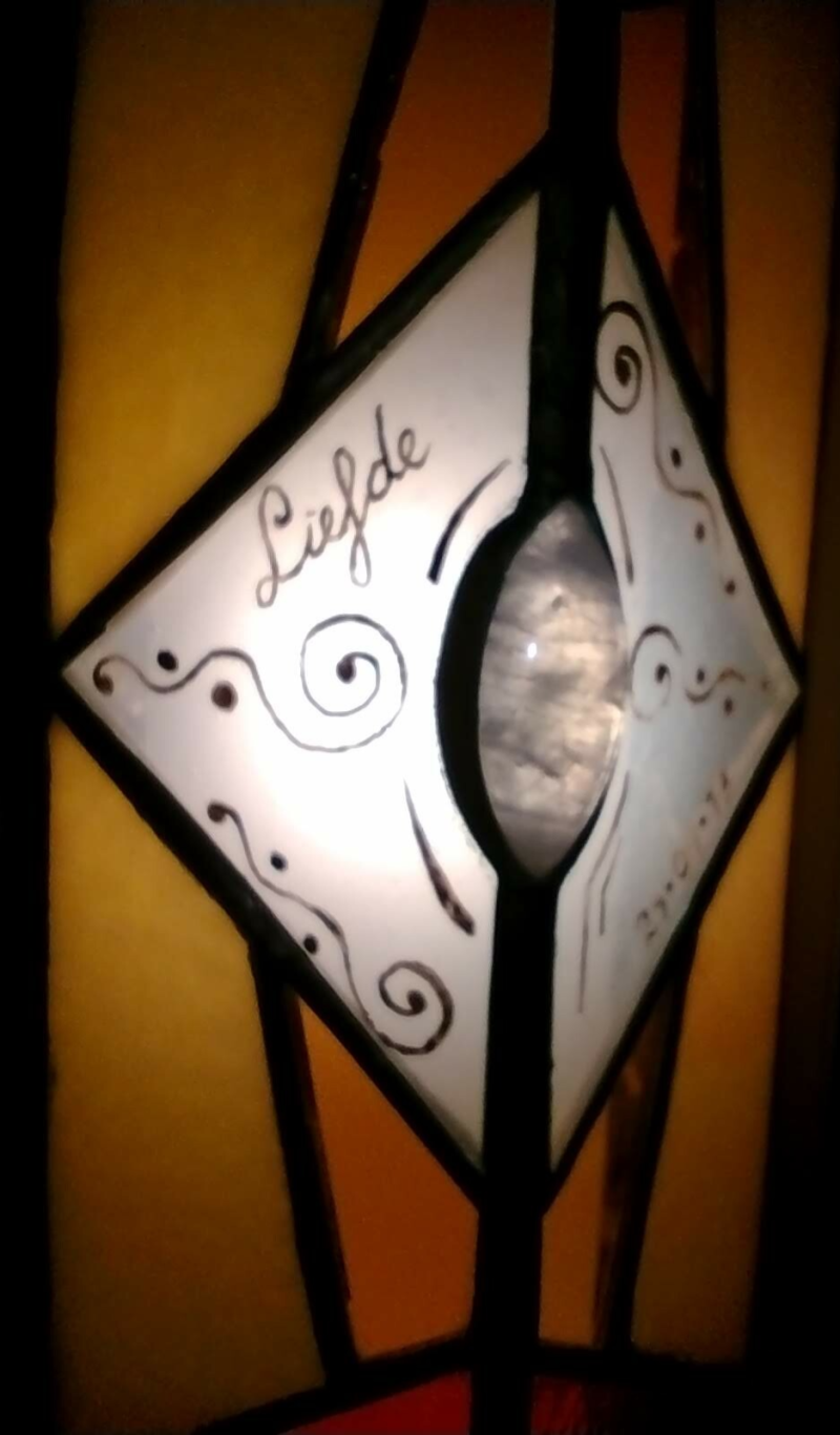 Onderstaande lamp is uitgevoerd in koperfolie techniek met brandschilderen en houtgedraaide knoppen